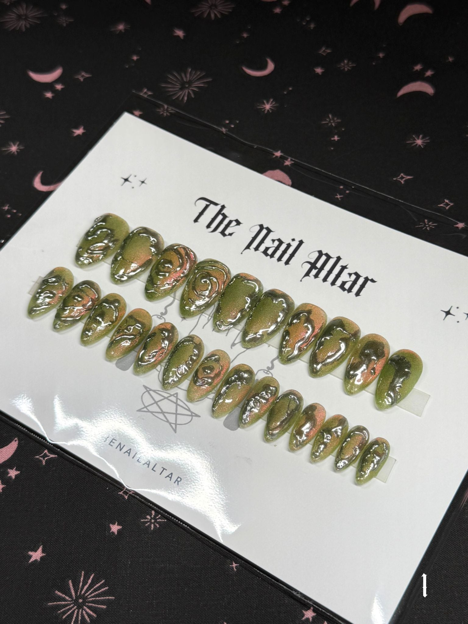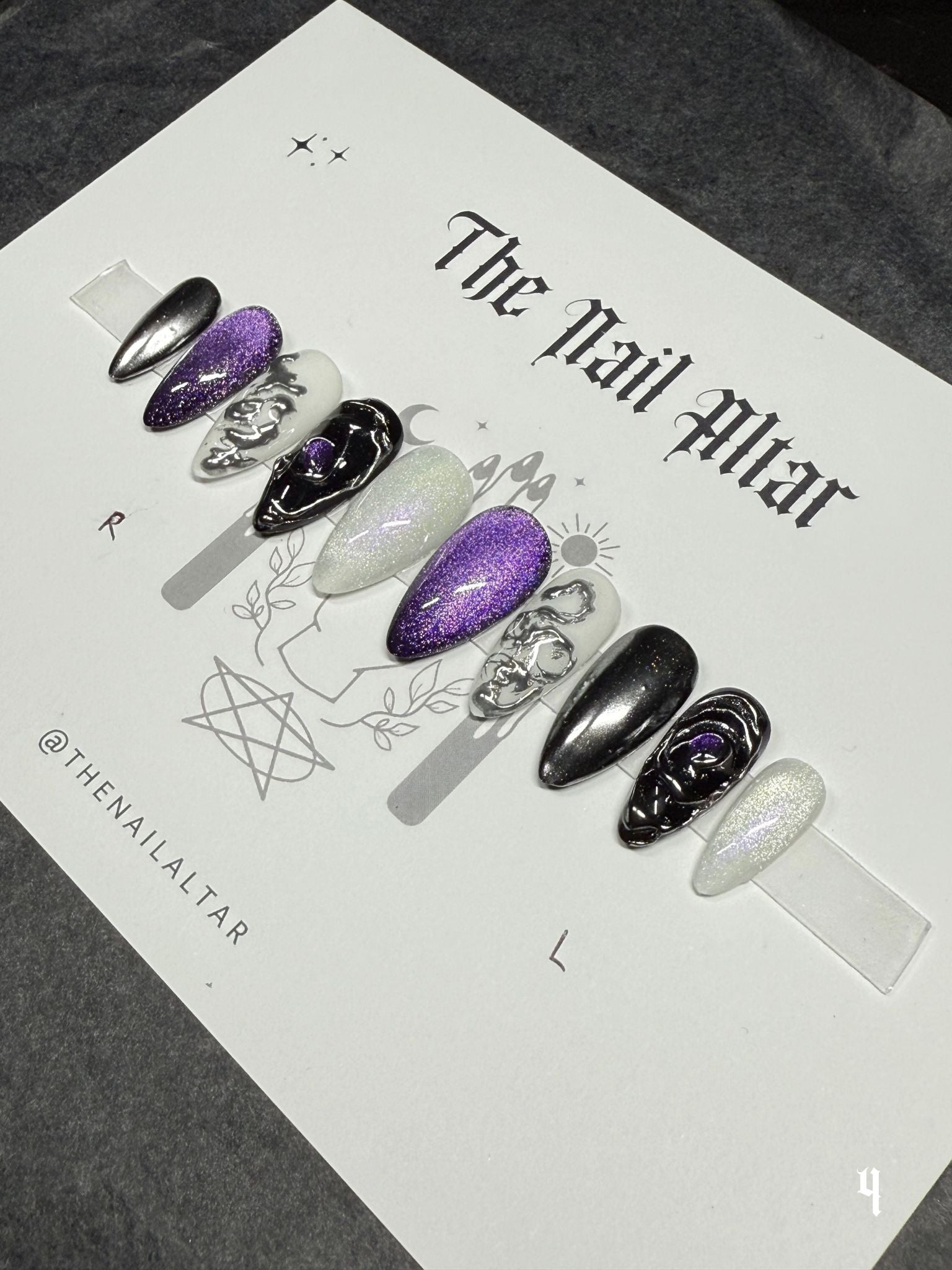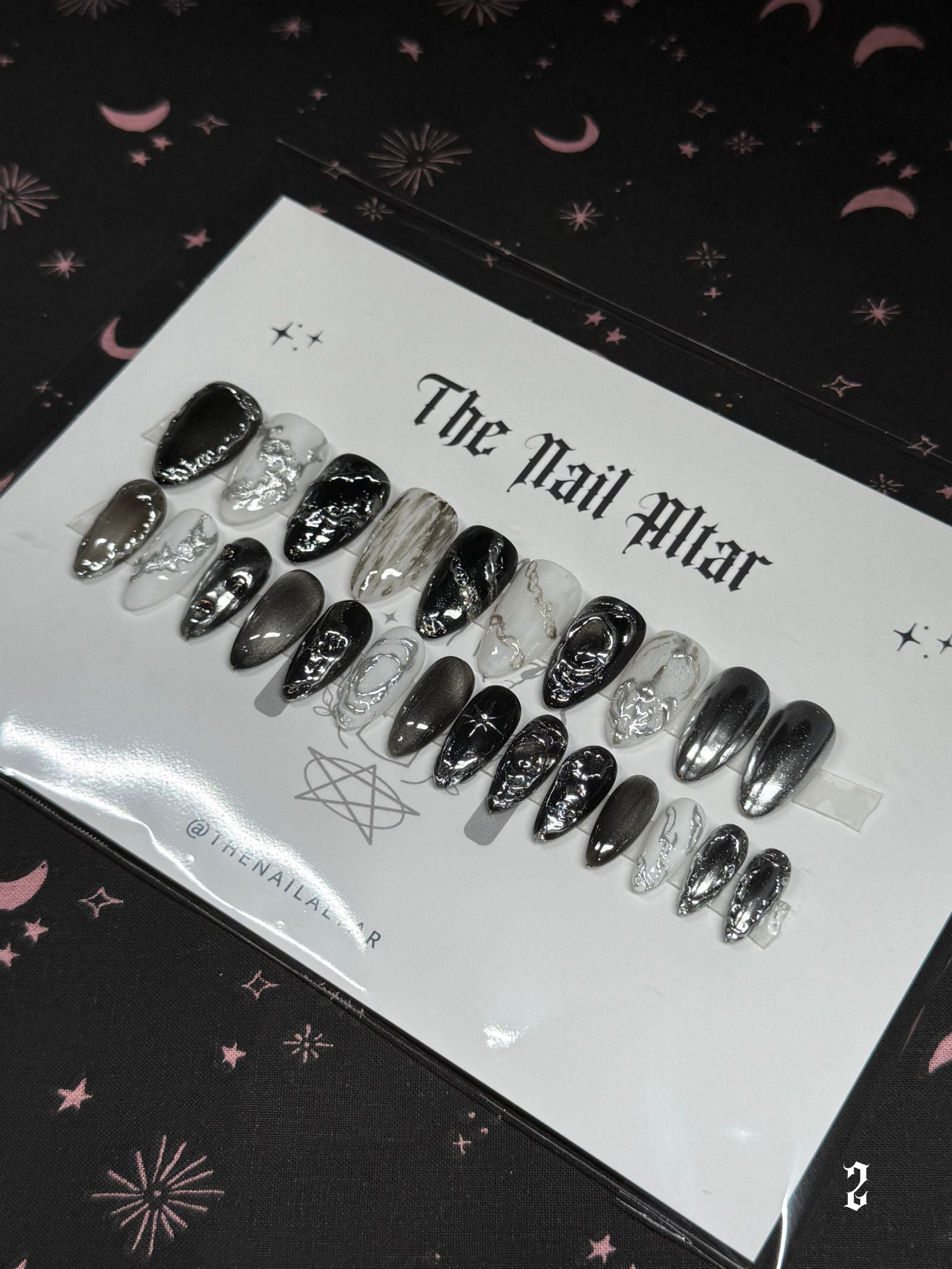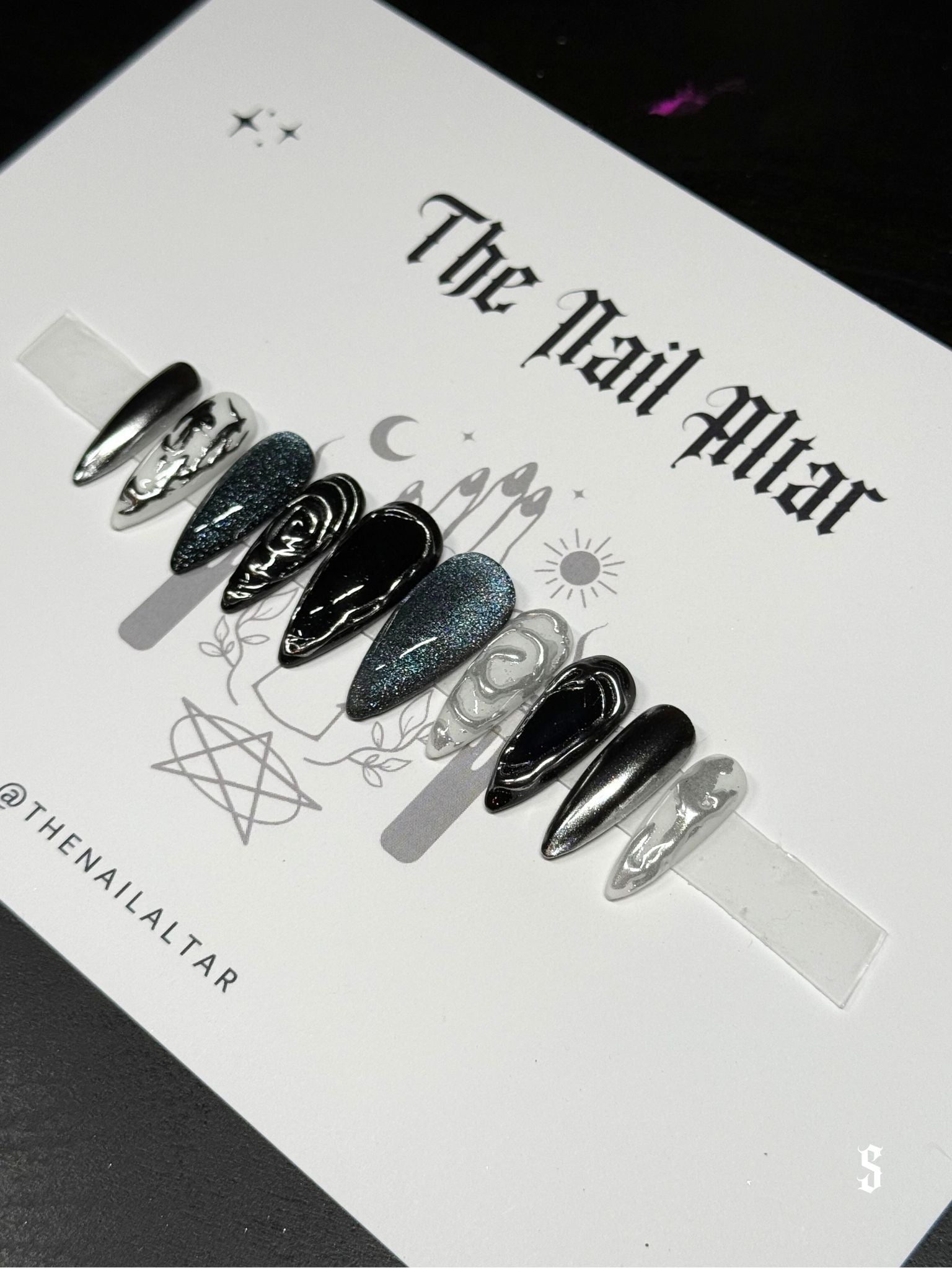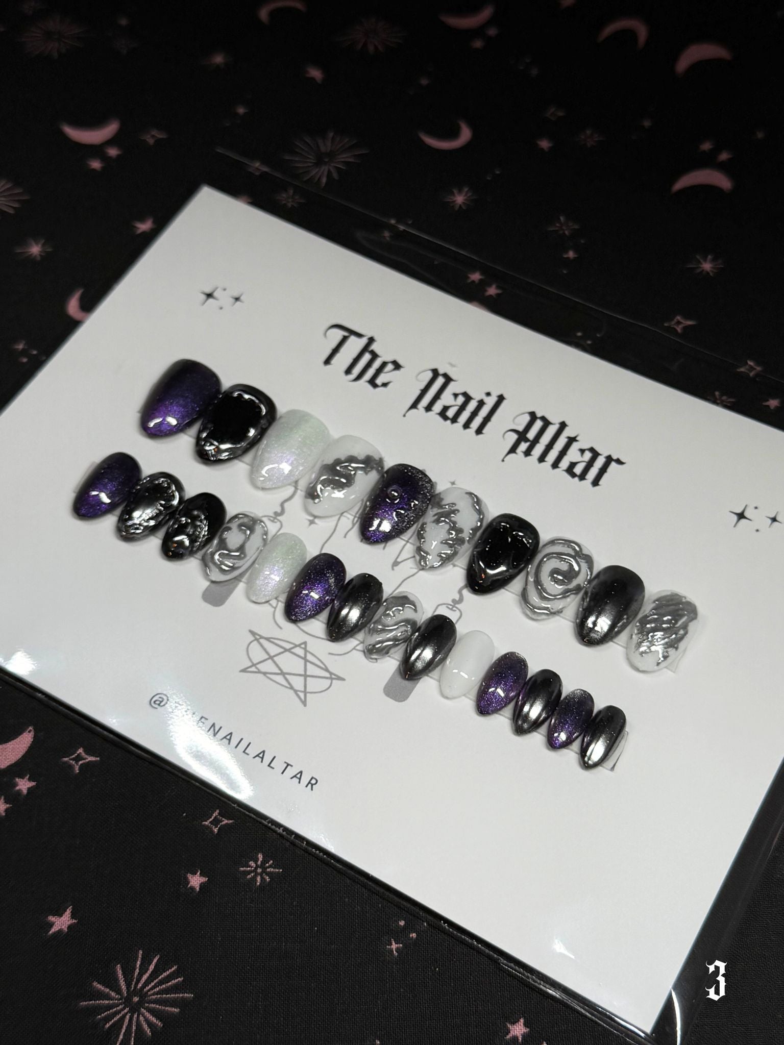 Summon your inner goddess with these chrome accents. Hand-painted on 100% soft gel nail tips for strength that endures every spell. Wear them once, twice, or as many times as the moon calls.