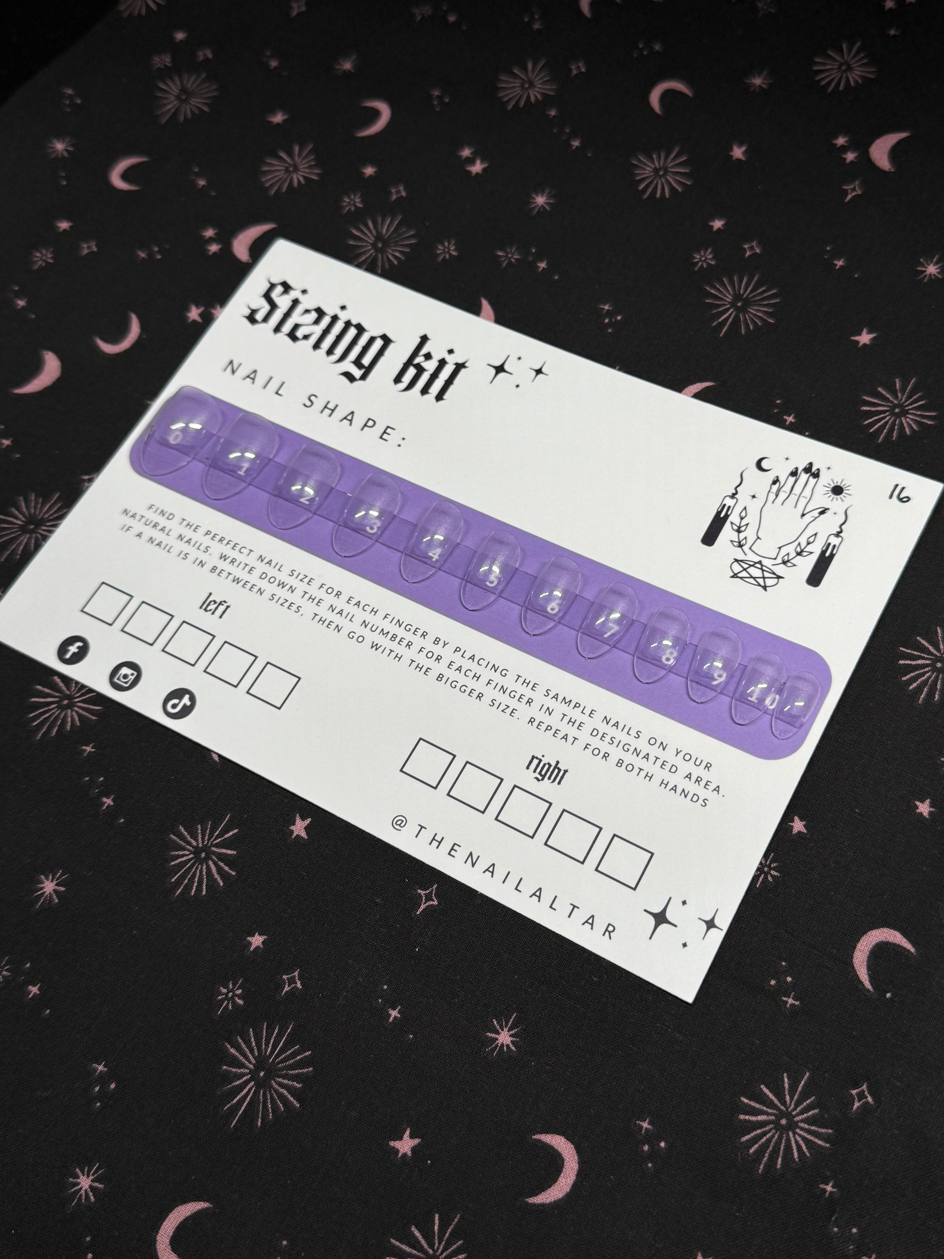 Every shape has its own fit and each shape requires its own dedicated sizing kit. Sizing can vary between shapes, and even the same shape in a different length can enchant differently depending on your natural nail bed length. If you're unsure which shape will best serve your look, send a few clear photos of your natural nails to me. I'll gladly divine the perfect fit for you.